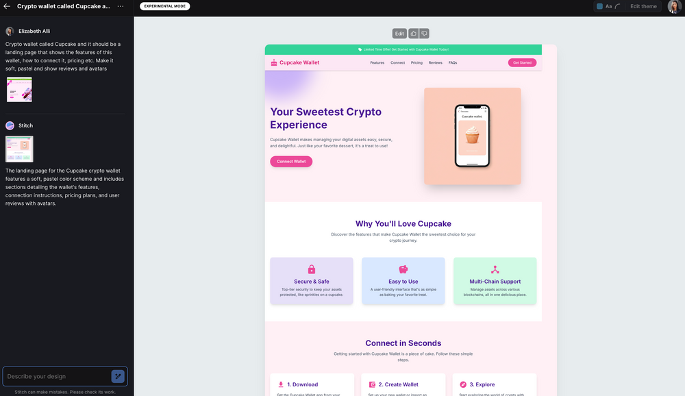 Google Stitch is Google’s take on UI creation with AI. It allows you to vibe designing your user interfaces for quick and professional results. It has Figma integration, code production, and recently added MCP integration.