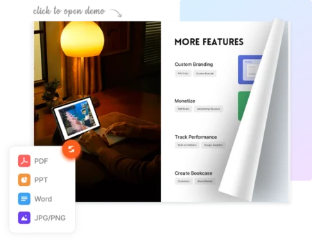 FlipHTML5 converts your PDFs, PPTs, or JPGs into interactive catalogs, magazines, and online brochures. It offers a wide range of customizable templates and uses AI to improve your texts, generate images, and add interactive elements like videos or chatbots.