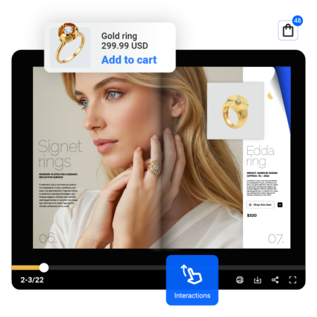 An interactive catalog is a digital publication that integrates interactive elements for a more immersive reader experience. Unlike a traditional catalog, it can include videos, links, and animations, thereby educating customers about products and directing them directly to your online store to make a purchase.
