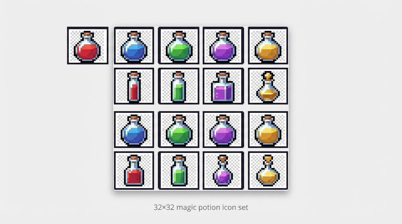 Down-resing a 1024-pixel Midjourney render rarely looks right. PixelVibe avoids that issue by starting at the target resolution. We prompted a 32 × 32 magic-potion icon set and saw uniform palettes, dithering, and outlines immediately. Every sprite exported with a transparent background, ready for the engine.