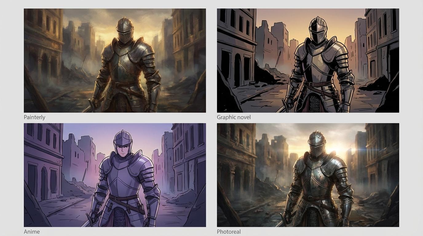 Continuity is the downside. Ask for the same knight in a new pose and the heraldry often shifts unless you restate every element. With no custom model training, each prompt starts fresh.