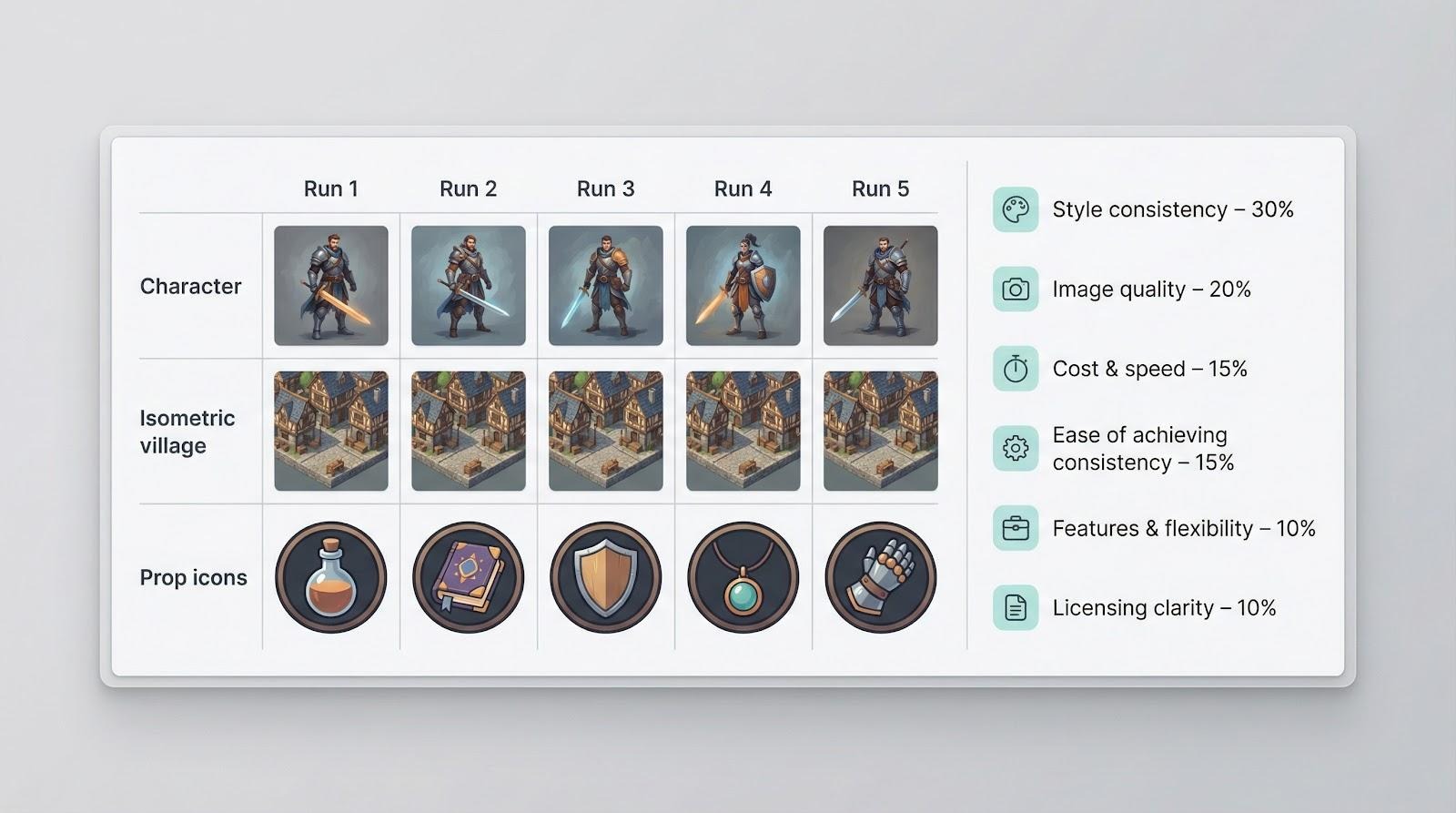 First, we wrote three benchmark prompts: a character, an isometric village, and a set of ornate prop icons. They cover the core assets most indie teams need. We ran each prompt five times per tool and set the 15 results side by side. That grid made any style drift, or rock-solid cohesion, impossible to miss.