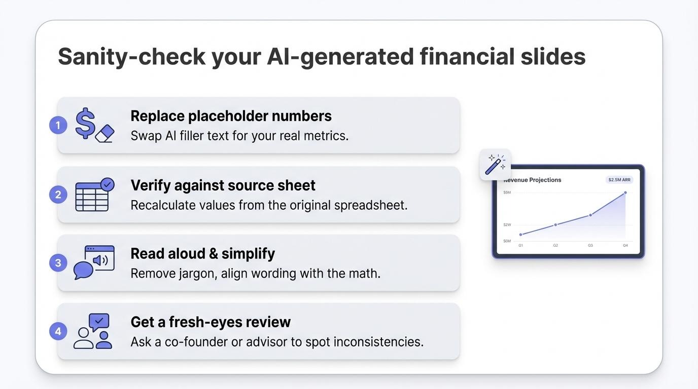 Start by replacing every placeholder figure the tool inserts. Some generators drop in “$5 million ARR” as filler. Swap in your real metrics right away, then reread the slide to confirm the wording still matches the math.