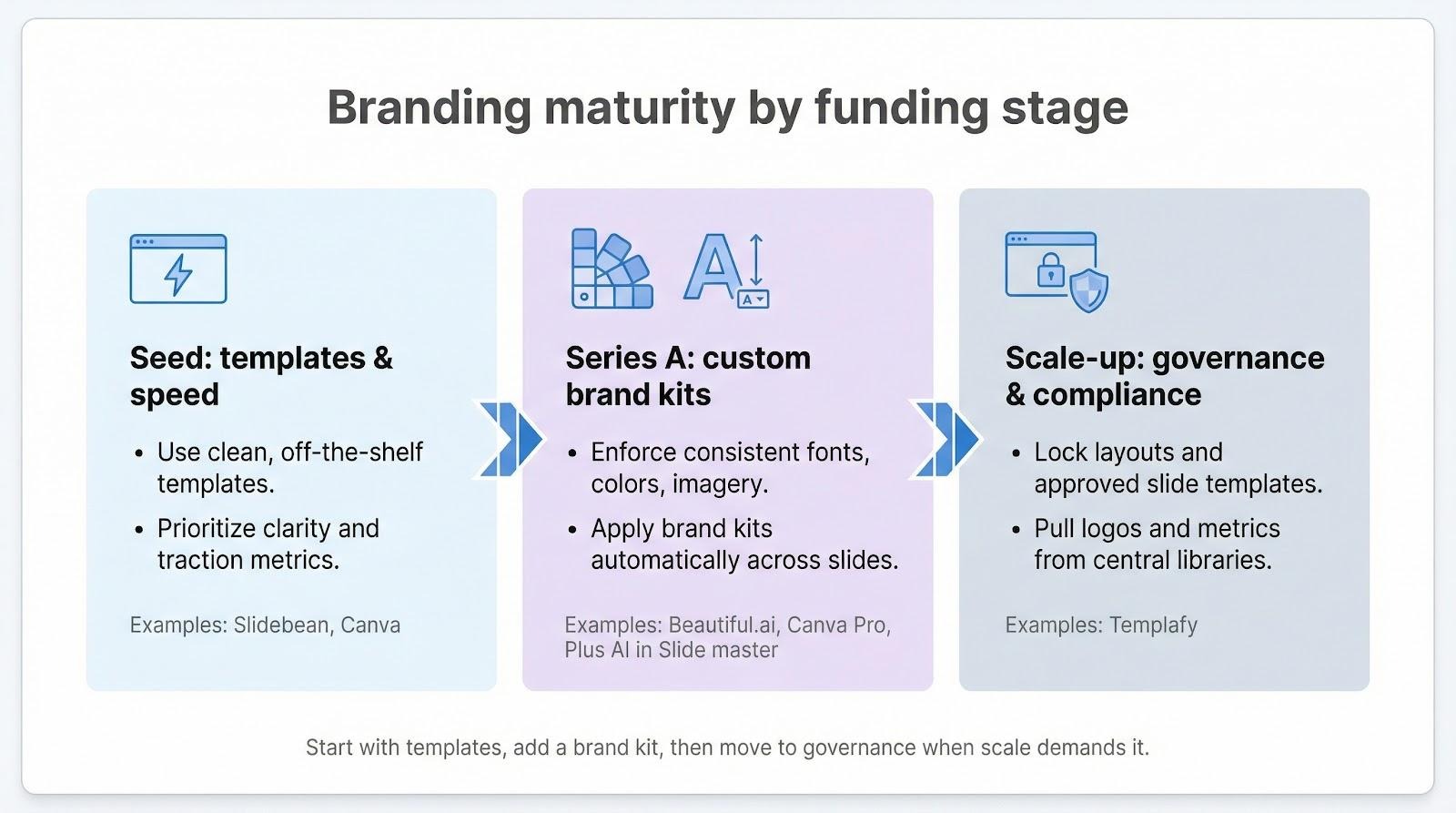 Takeaway: start with templates when you are scrappy, add a brand kit once your identity gels, and move to governance tools only when scale requires it. Match the AI pitch deck tool to your stage, and you will avoid both over-engineering and underwhelming your deck.