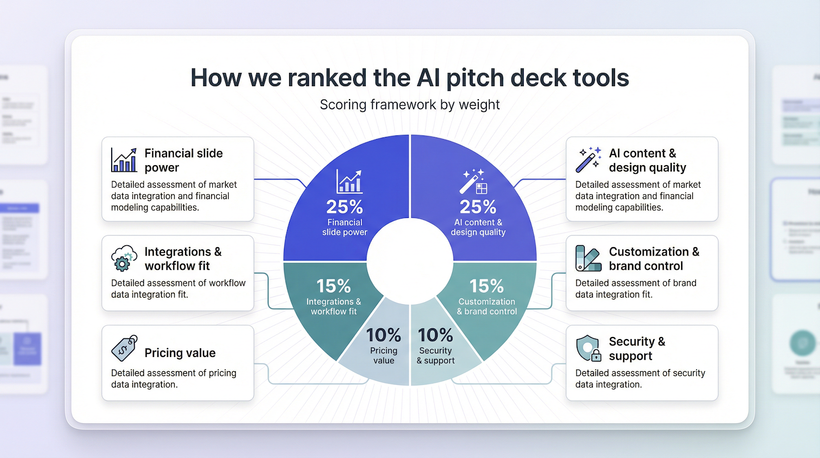 First, we counted financial slide power and AI content + design quality at 25 percent each. If a platform fails to chart revenue or fills slides with bland copy, it sinks quickly.