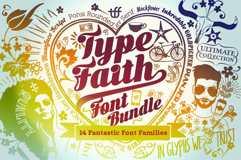 This Ultimate TypeFaith Fonts Bundle features more 40 different font styles covering a wide variety of styles from Art Deco to Brutal Brush fonts. Toss in OpenType features such as ligatures, alternates, swashes, ornaments and more, and the possibilities suddenly become endless!