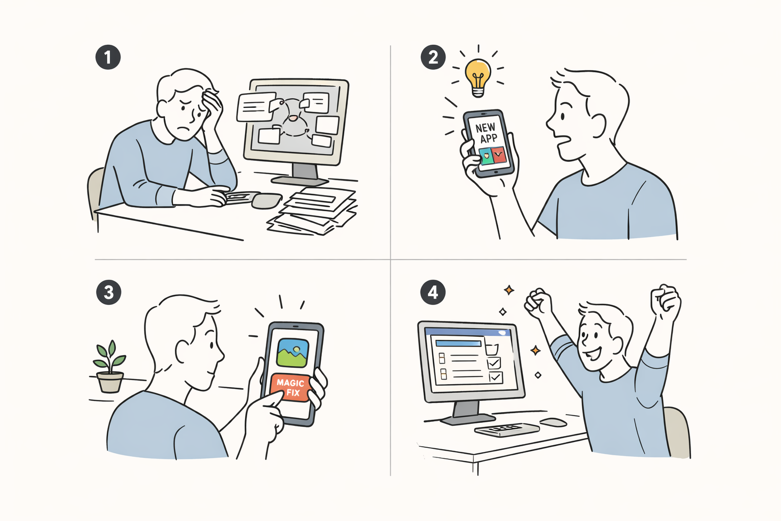 “Four-panel storyboard showing a person discovering a new app: 1) frustration with old way 2) discovering app 3) trying feature 4) happy result. Simple line art, clear emotions”