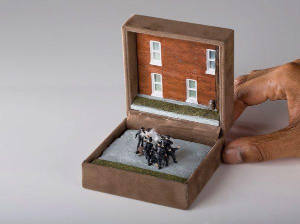Talwst decided to make miniature scenes inside the box. He did a wonderful job, with amazingly detailed dioramas that depict every day scenes, but also some news events, like the Mike Brown shooting.