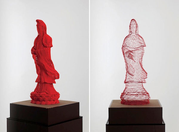 The artist works with layers of paper that are cutted and held together to form Buddhas, Darth Vader, or Greek style sculptures. The see-through versions still have an outline that keeps them recognizable.