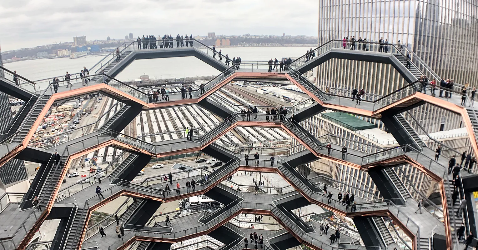 New York’s Vessel, the 16-story honeycomb of staircases at Hudson Yards, offers a different lesson. Designed by Heatherwick Studio, it contains 154 interconnecting flights of stairs, 80 landings, and nearly 2,500 steps. Visitors can climb to the top, but the real design intelligence is in what happens along the way.
